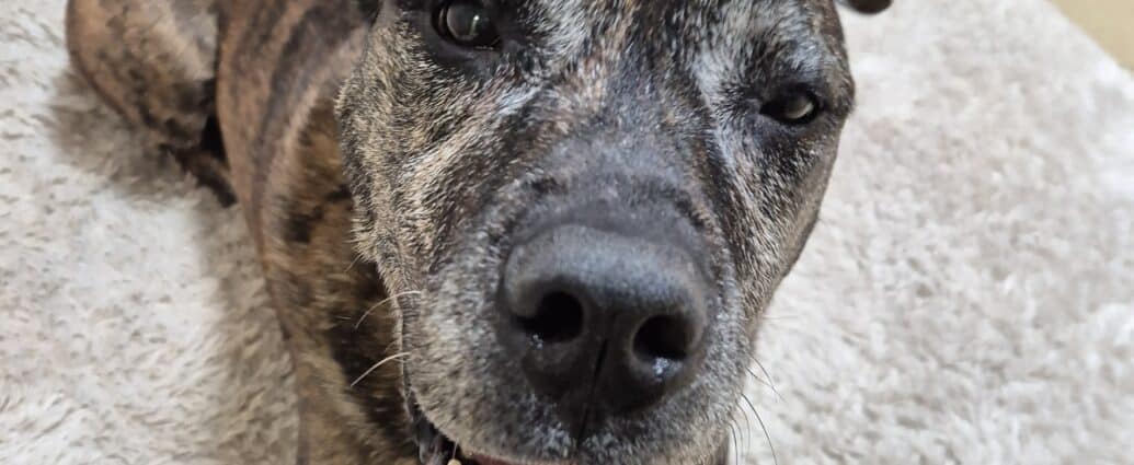Peitsche ist heute ein etwa 10 Jahre alter Staff-Mix-Rüde, rund 60 cm groß, etwa 34 Kilogramm schwer und selbstverständlich kastriert, gechipt und geimpft. Doch diese nüchternen Fakten erzählen nicht das, was Peitsche wirklich ausmacht.